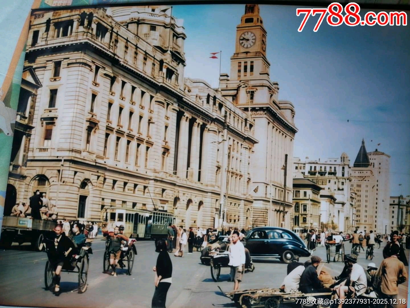 八寸彩色翻新照片《民国时期上海外滩卡车电车轿车黄包车自行车板车独轮车万国建筑群》(au43351545)